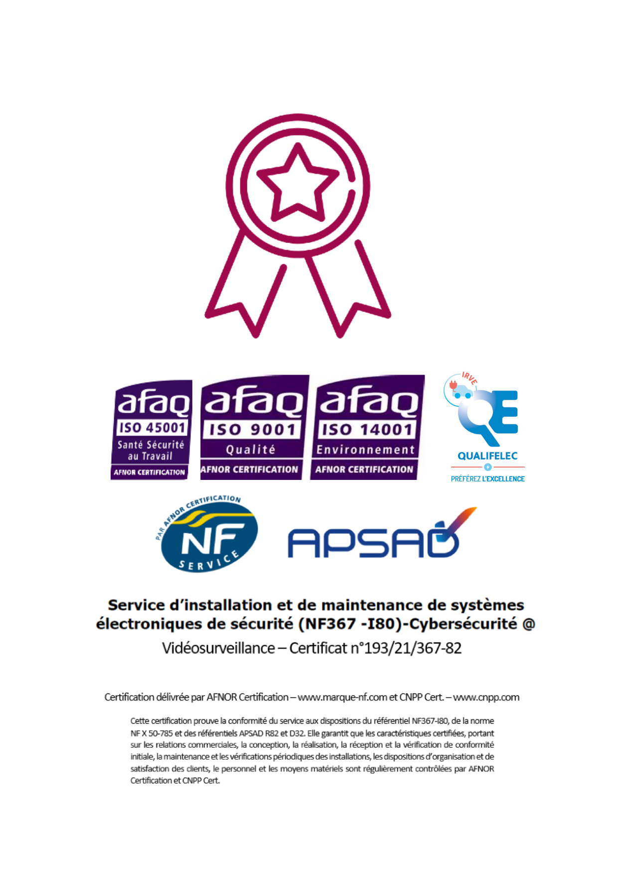 - Certificat APSAD R82-D32 (Installation et maintenance systèmes de vidéosurveillance, avec dimension cybersécurité)